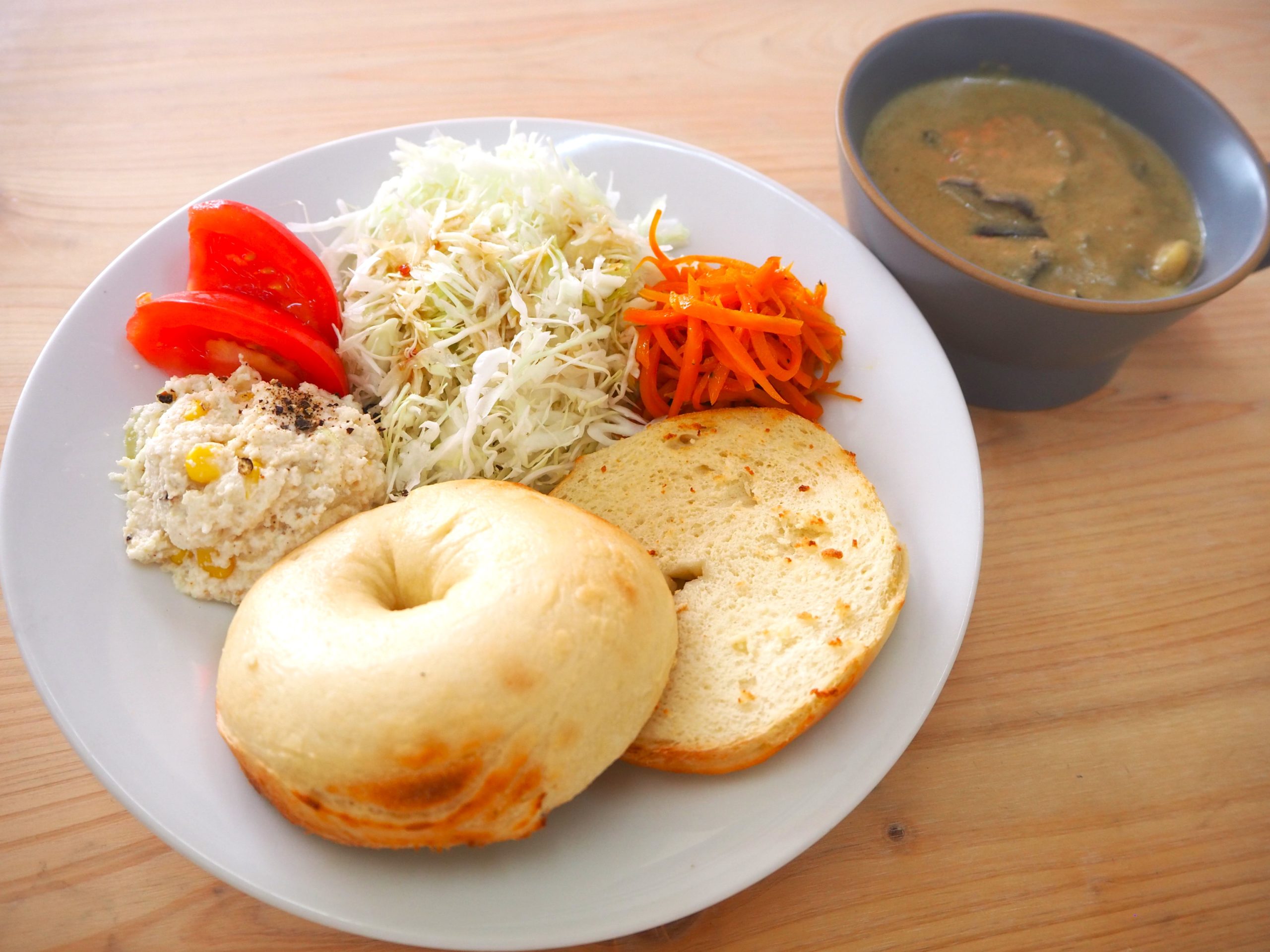 プレートに乗っているベーグルは、サラダや野菜を挟んだり、スープに付けながら食べたり、色々な食べ方を楽しむことが出来ます。