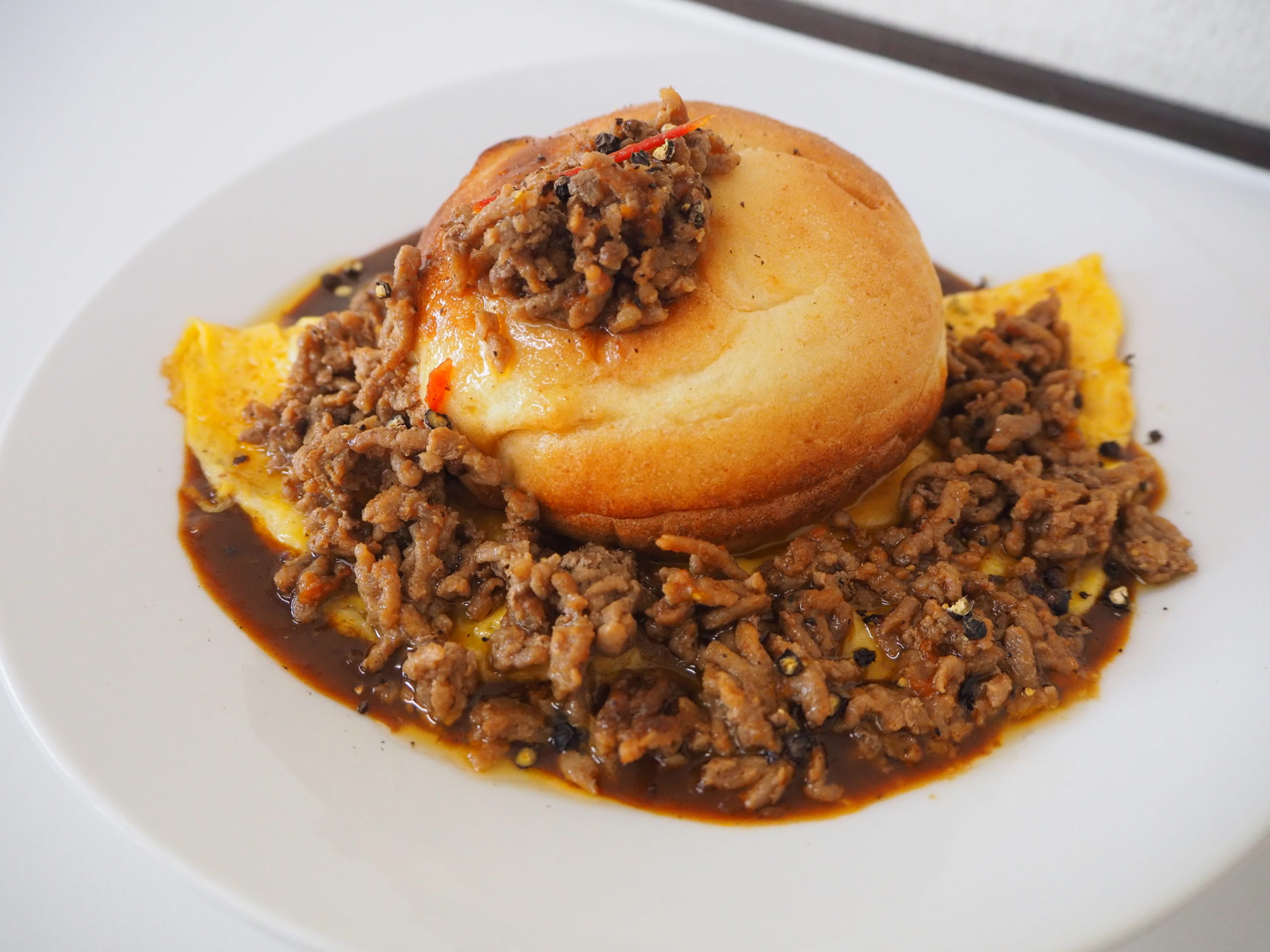 ベーグルをドーン!と真ん中に乗せ、お肉たっぷりのボリューム満点のオムハヤシとなっています。
